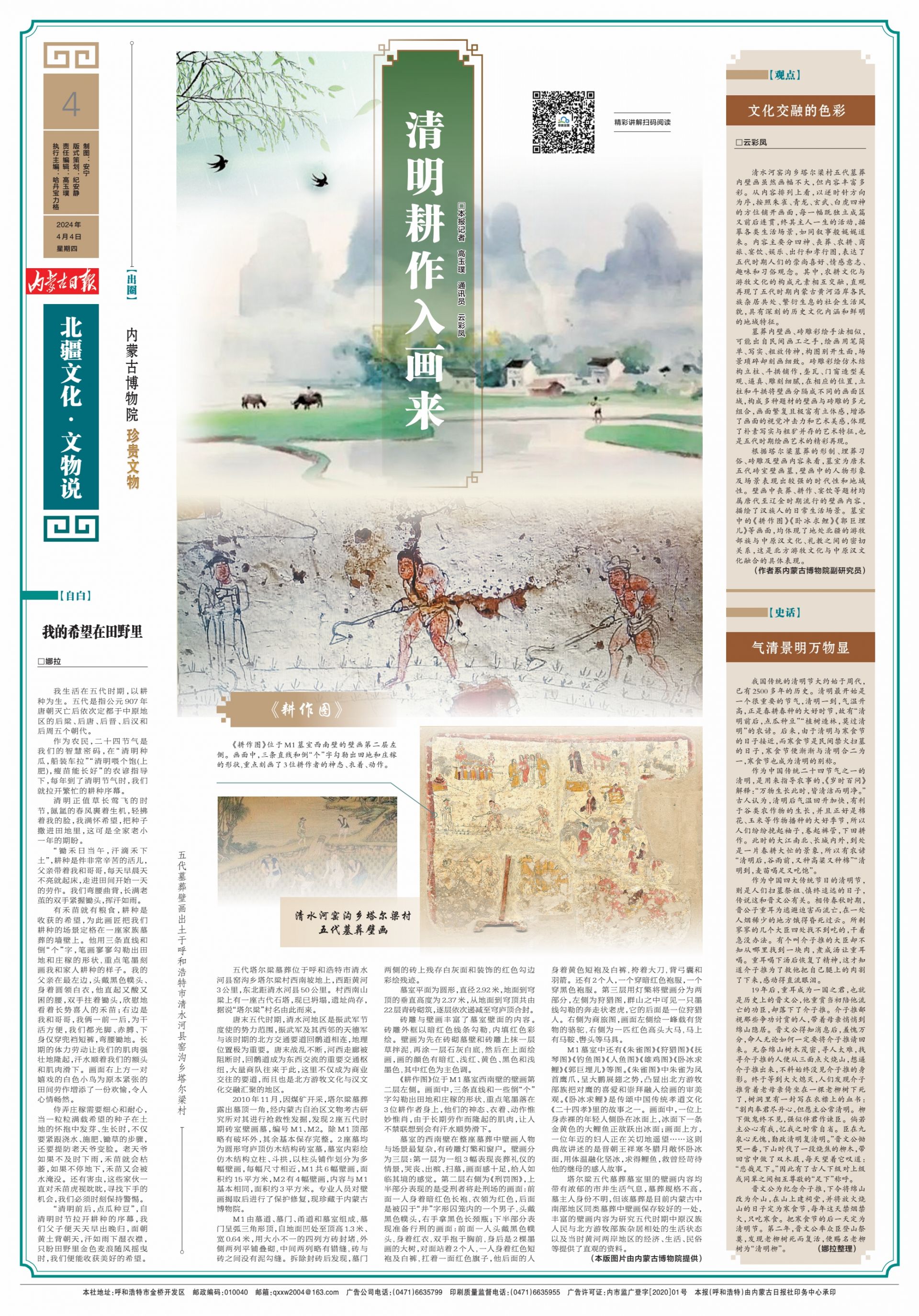 《耕作图》位于M1墓室西南壁的壁画第二层左侧。画面中,三条直线和一些倒“个”字勾勒出田地和庄稼的形状,重点笔墨落在3位耕作者身上,他们的神态、衣着、动作惟妙惟肖,由于长期劳作而隆起的肌肉,让人不禁联想到会有汗水顺势滑下。