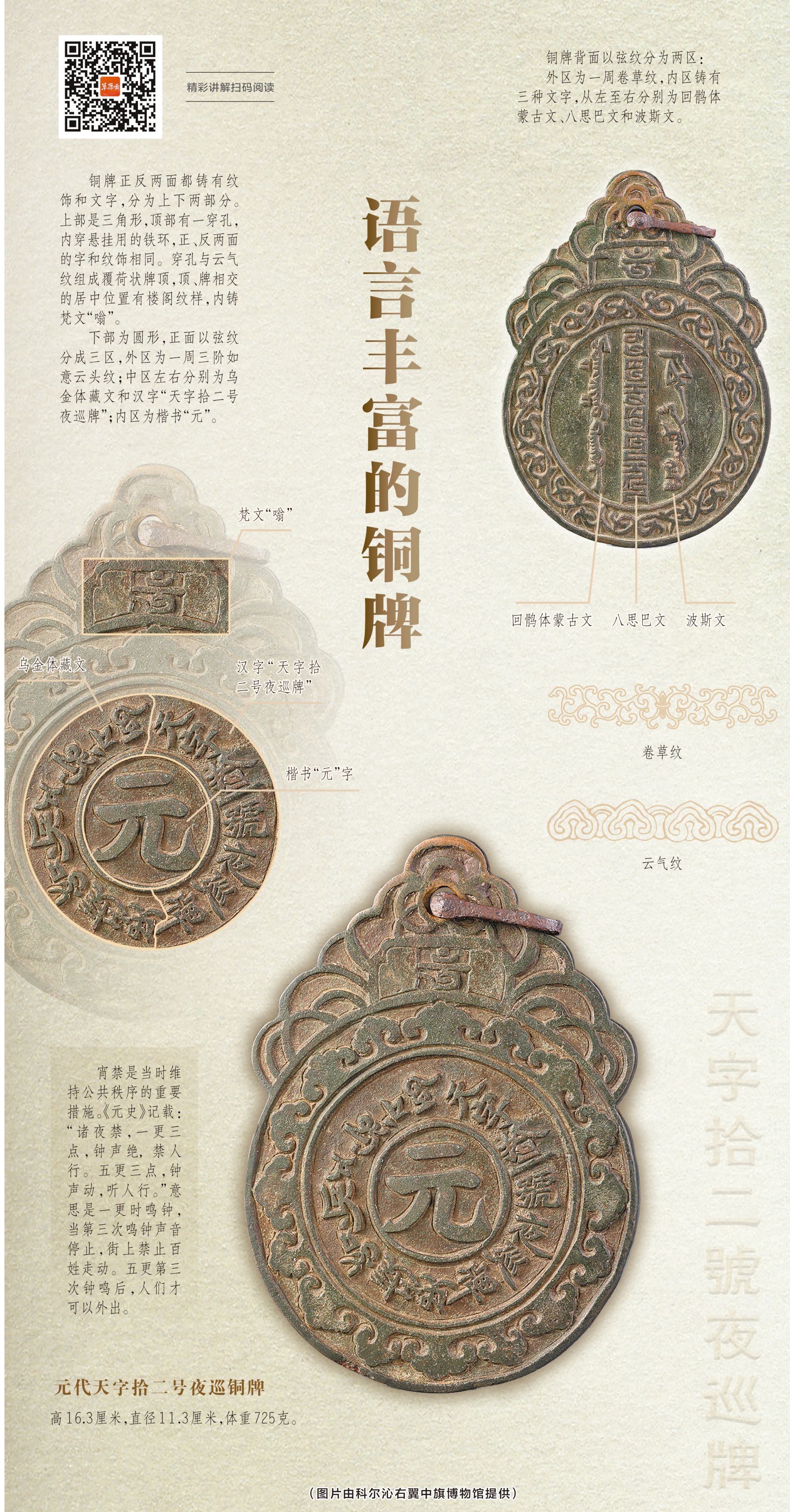 我的正反两面都铸有纹饰和文字,分为上下两部分,上部是三角形,顶部有一个穿孔,内穿悬挂用的铁环,正、反两面的字和纹饰相同。穿孔与云气纹组成覆荷状牌顶,顶、牌相交的居中位置有楼阁纹样,内铸梵文“嗡”。下部为圆形,正面以弦纹分成三区,外区为一周三阶如意云头纹;中区左右分别为乌金体藏文和汉字“天字拾二号夜巡牌”;内区为楷书“元”字。背面以弦纹分为两区:外区为一周卷草纹,内区铸有三种文字,从左至右分别为回鹘体蒙古文、八思巴文和波斯文。当工匠将我从模具中取出时,我已成为元代多语世界的缩影。