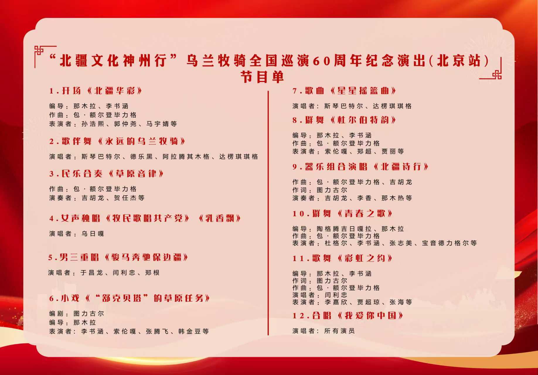 10月9日19时,“北疆文化神州行”——乌兰牧骑全国巡演60周年纪念演出(北京站),将在北京市朝阳剧场继续上演,这支从祖国北疆走来的“红色文艺轻骑兵”,用悠扬的歌声、灵动的舞姿,展现北疆文化的独特魅力,让首都观众近距离感受北疆文化的深厚底蕴。