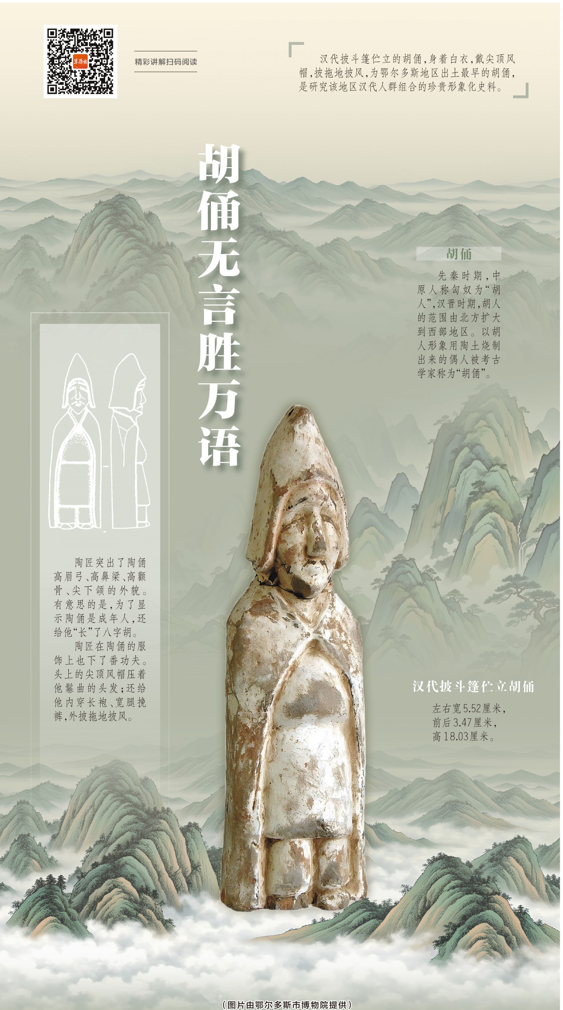 鄂尔多斯市博物院3楼3号展厅陈列着一件汉代披斗篷伫立的胡俑,出土于鄂托克前旗三段地汉墓,身着白衣,戴尖顶风帽,披拖地披风,为鄂尔多斯地区出土最早的胡俑,是研究该地区汉代人群组合的珍贵形象化史料。