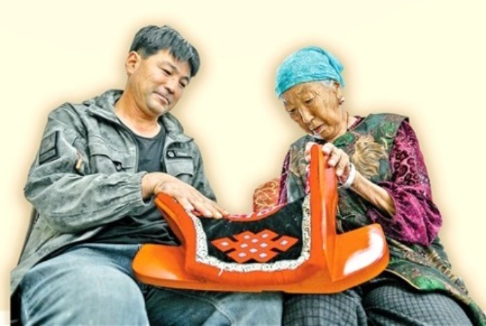 “马鞍想要舒适,坐起来不劳累,鞍垫一定要做得结实,配色也很考究。”阿拉坦巴根79岁的母亲扎力玛,是札萨克图刺绣兴安盟级非物质文化遗产代表性传承人,也是他最好的帮手。扎力玛布满皱纹的手指捏着银针,在靛蓝色鞍垫上游走,卷草纹与云纹如流水般舒展。阿拉坦巴根伏在母亲膝前,望着母亲手中的鞍垫说:“母亲绣的鞍垫配上我制作的马鞍肯定好看。”