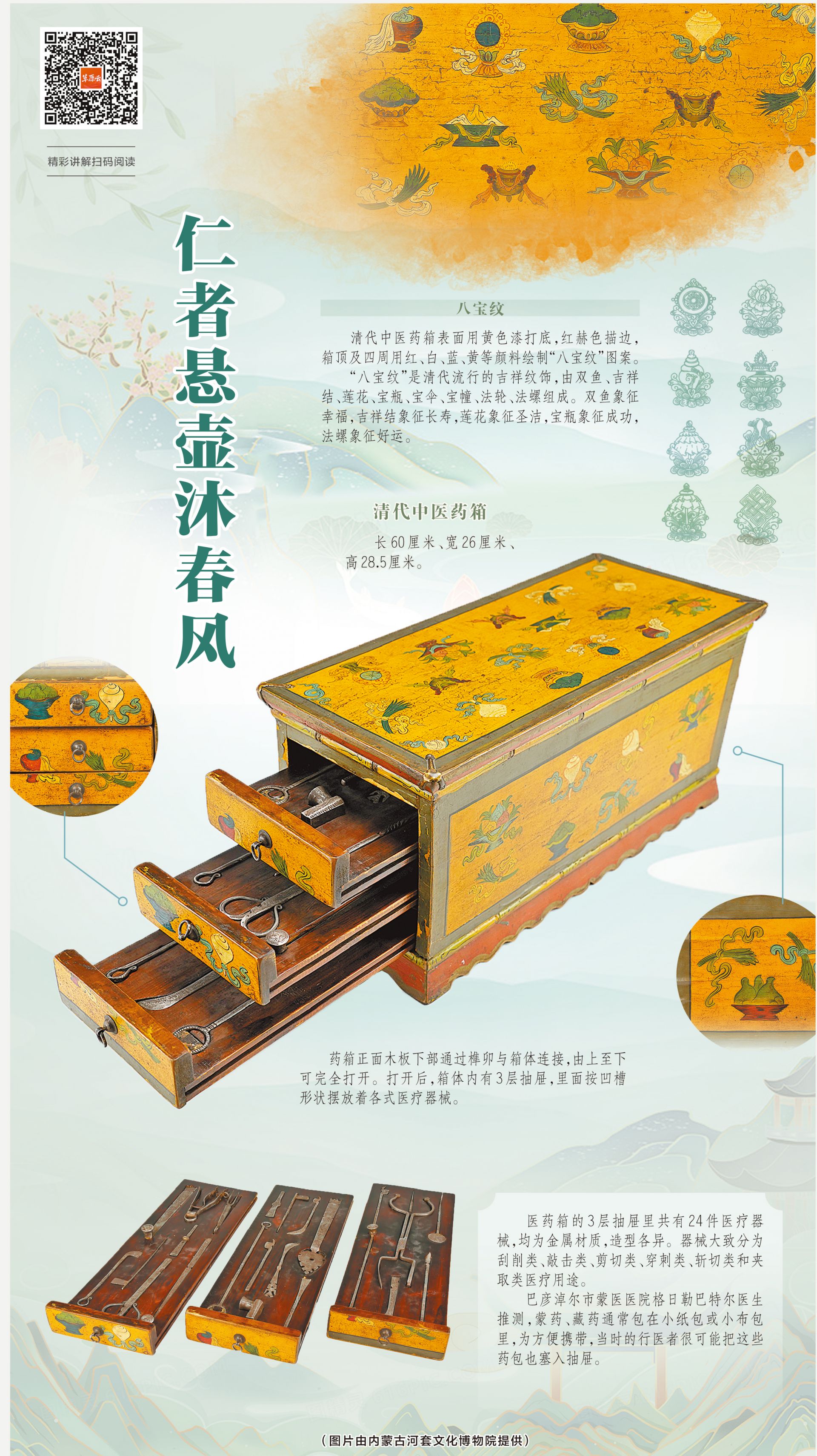 仁者悬壶沐春风。凝视这套清代中医药箱,无论是箱体上的精美图案,还是它抽屉里为医疗器械量身雕刻的凹槽,还有金属医疗器械,让我们不仅感受到杏林春暖,更感受到民族文化融合的魅力。(草原云·内蒙古新闻网记者 高莉 通讯员 高奇峰)