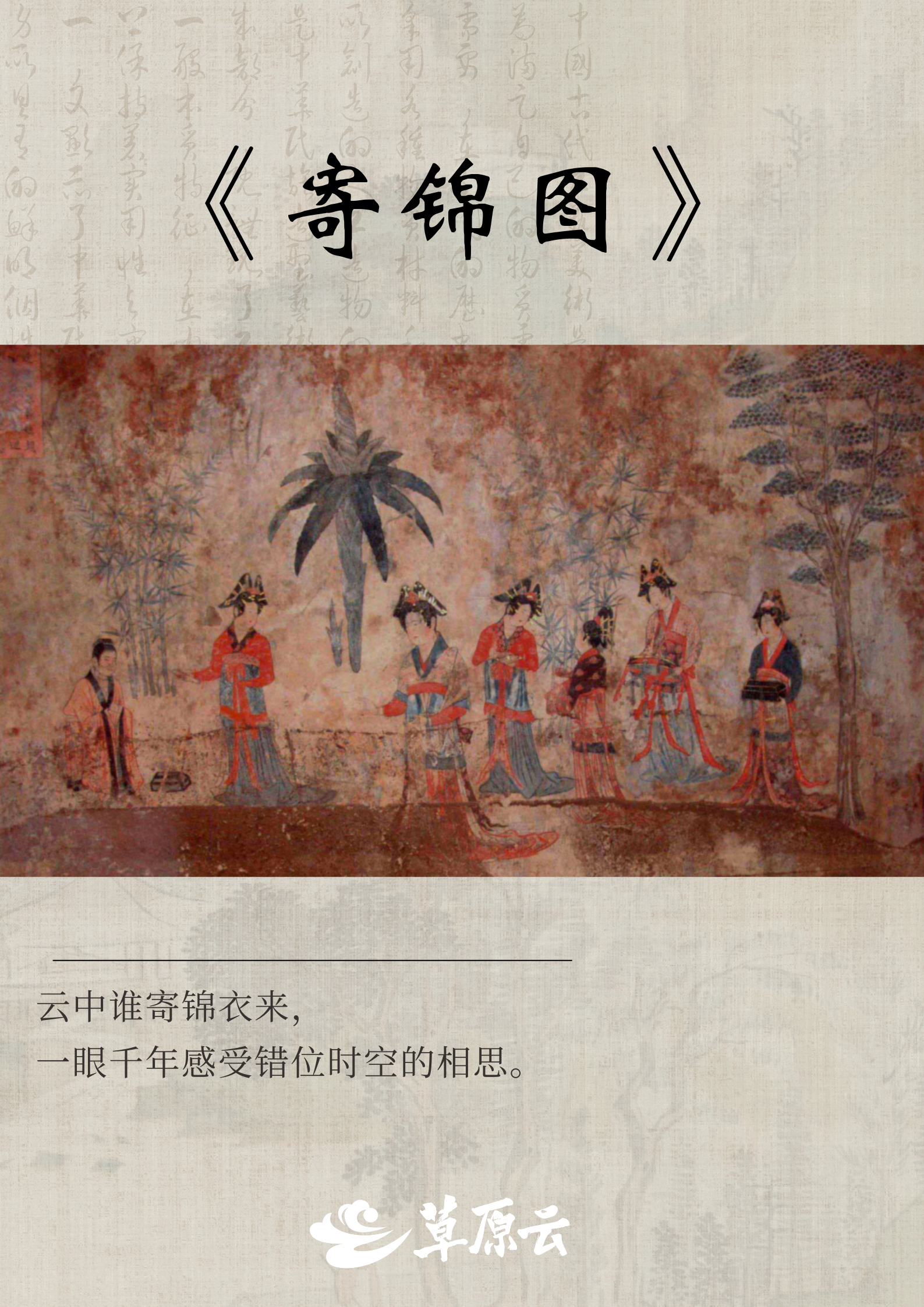 我是辽代宝山壁画《寄锦图》。我为大家讲述了一个关于相思的故事:一位叫苏若兰的夫人怀念远方的丈夫,给丈夫题写回文诗织造在锦上,寄给在远方征战的丈夫。