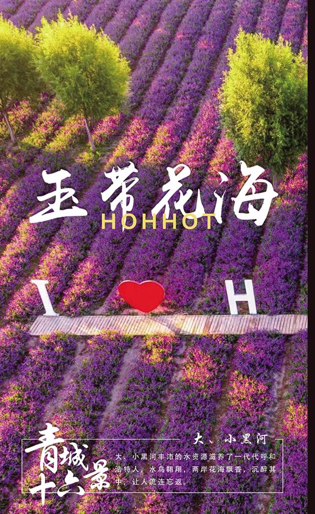 流经呼和浩特的黄河支流大黑河和小黑河,被誉为呼和浩特的母亲河,这两条丰沛的河水滋养了一代又一代呼和浩特人。现在的大、小黑河河面宽阔、河水清澈,波光粼粼,鱼翔浅底,水鸟翱翔……两河宛如两条洁白的哈达,飘然佩戴在美丽青城的脖颈上。河两岸目光所及之处都是宛如仙境的公园、游园和花海绿荫——这就是青城十六景中的第十四景“玉带花海”。