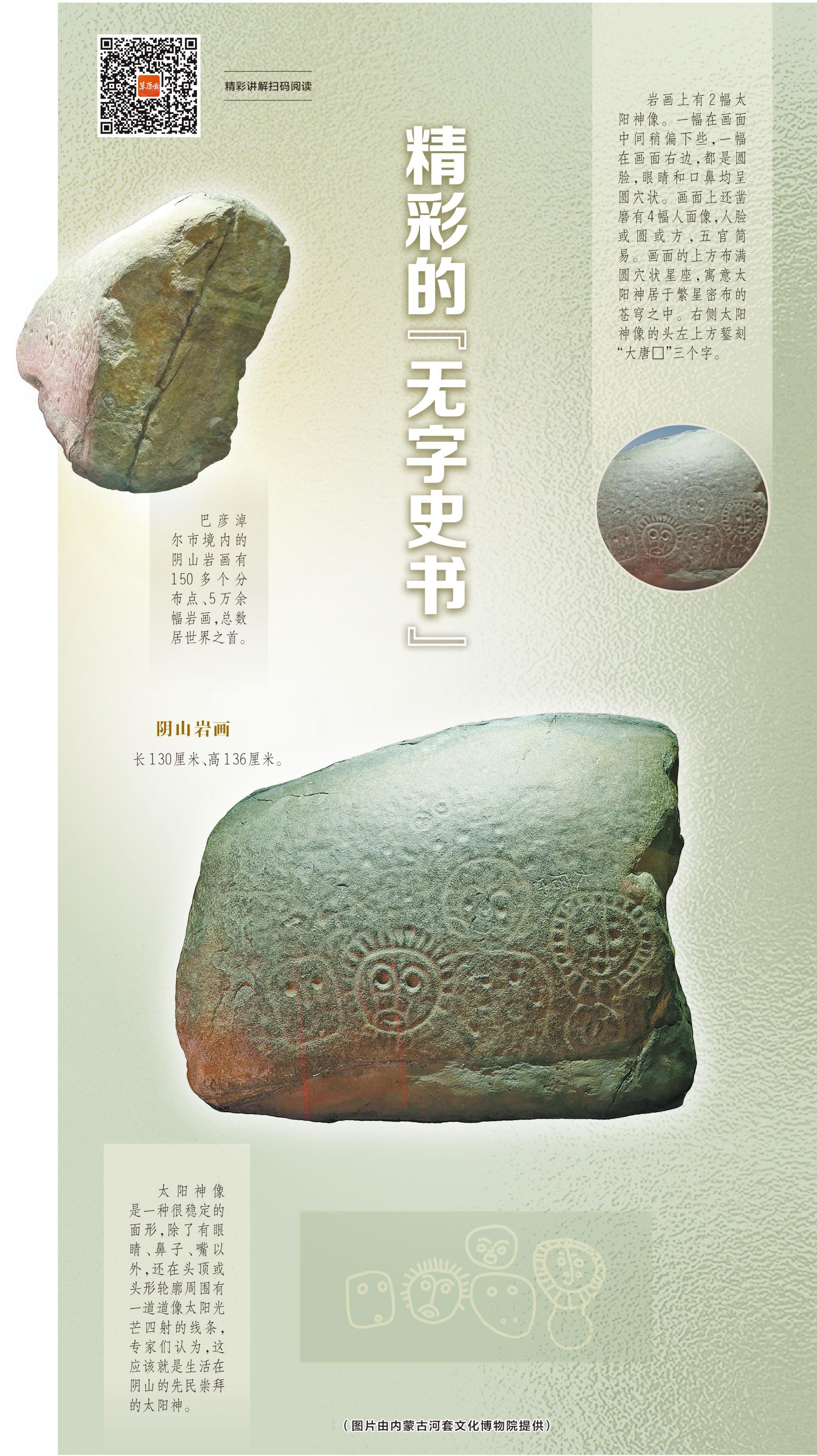 阴山山脉是河套平原的天然屏障,生活在这里的远古先民、古代劳动人民,经过打磨凿刻,创作了数万幅岩画。在数量众多的岩画中,考古学家首先发现的是人面像岩画,其中,人面太阳神像岩画以独特的艺术风格和深厚的历史文化内涵吸引着世人的目光。