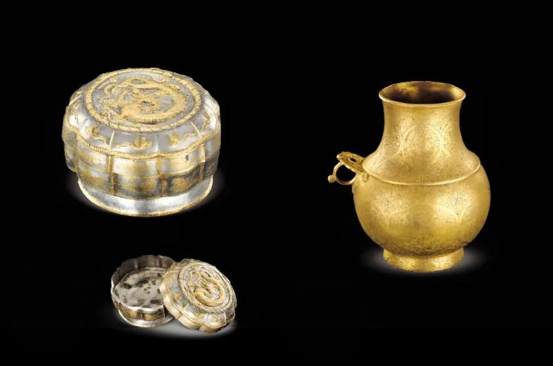 墓中出土的金花龙凤纹银奁和鋬耳银鎏金壶。