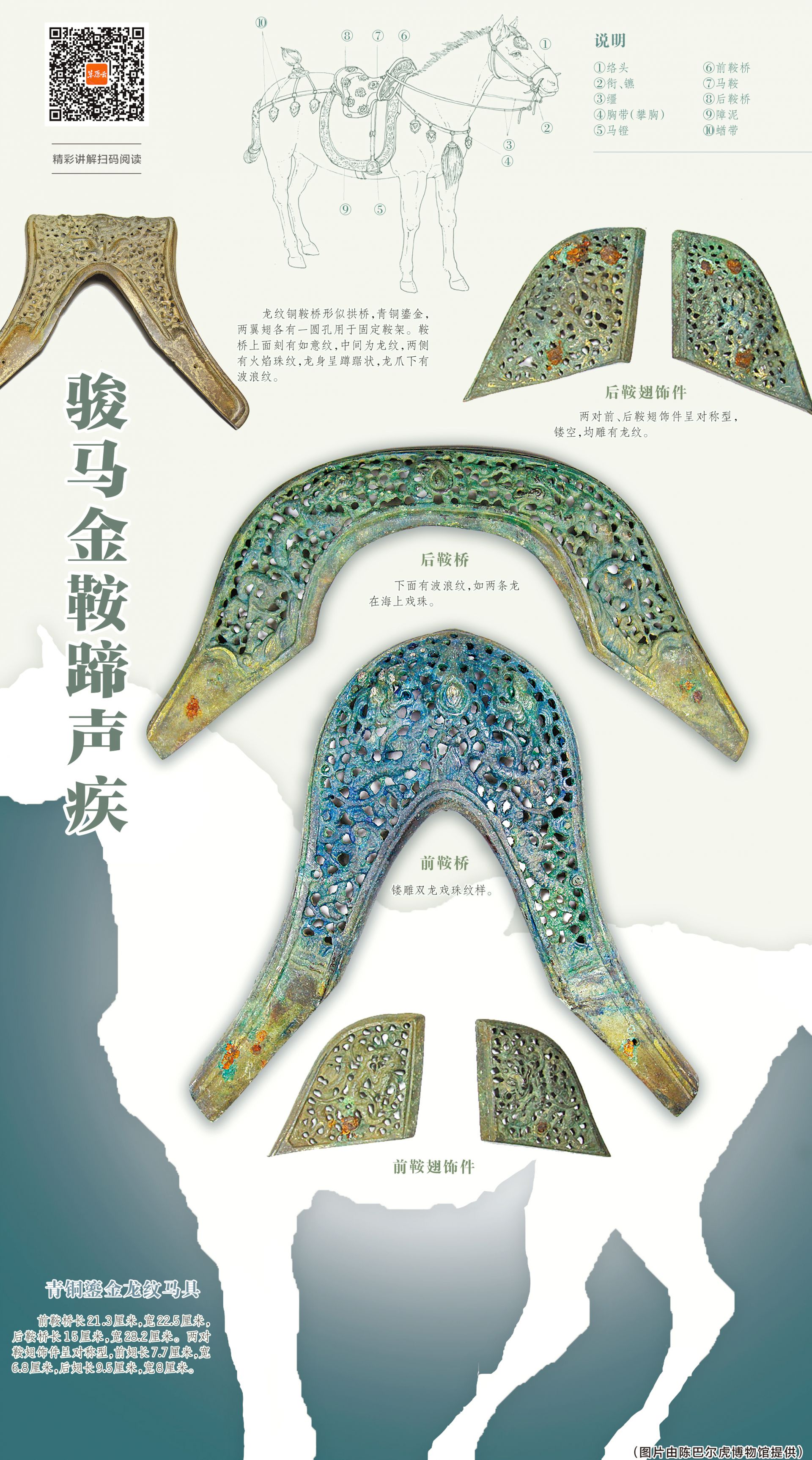我便是一套豪华漂亮的青铜鎏金马鞍饰件。转徙随时,车马为家是我们那时的生活环境。人们以马背为家,鞁具为控,鞍具为居,将对马的感情延伸到装饰马匹及马具上,愿意在这方面用最好的材质、最美图案,因此我们那时的马具有“甲天下”之美誉。