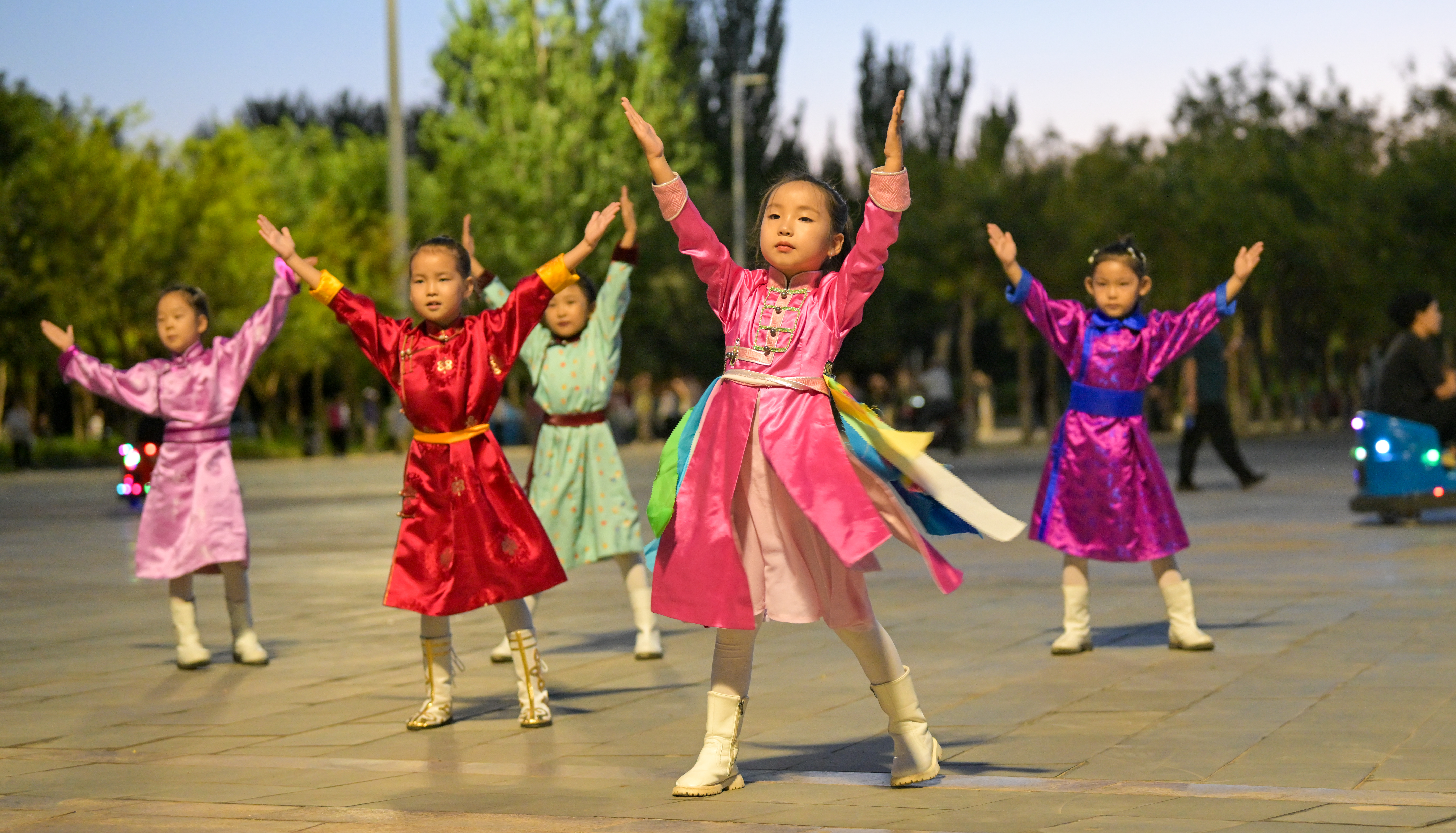 如今,每到下午额济纳旗的广场上、社区里,总能看见跳萨吾尔登的身影:老人们带着孩子踩节奏,年轻人跟着音乐学动作,偶尔还有游客停下脚步,跟着比划两下。阳光透过枝丫,在地面投下斑驳的影子,与舞步交织在一起,绘出一幅幸福生活的美好画卷。