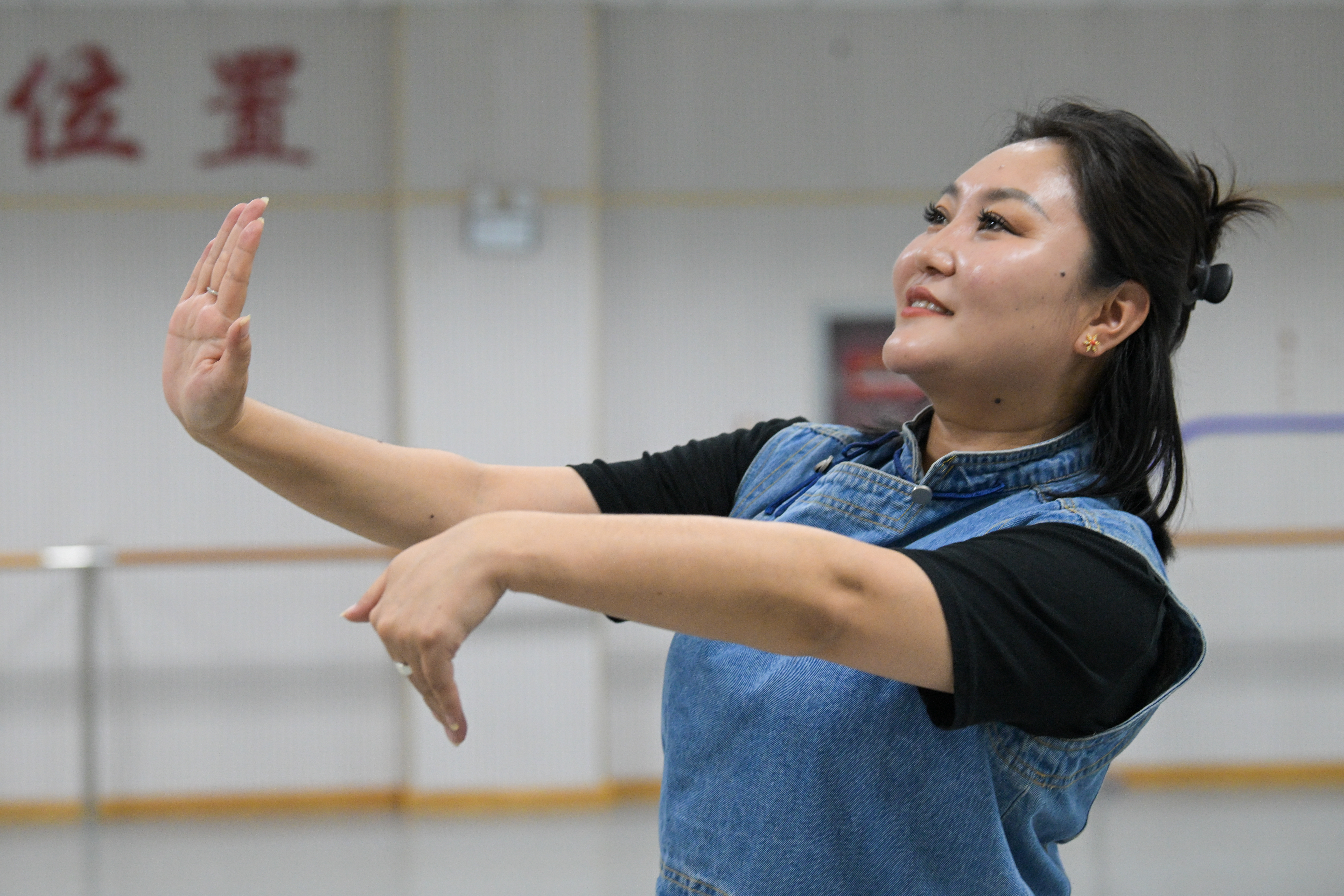 “你看这个动作是在模仿少女一手持镜、另一只手梳理头发;两只手叠在一起由内向外翻转,是在模仿牧民劳作时解绳子的手势。”乌日嘎边示范边讲解,萨吾尔登的每一个动作,都来源于牧民的生活。