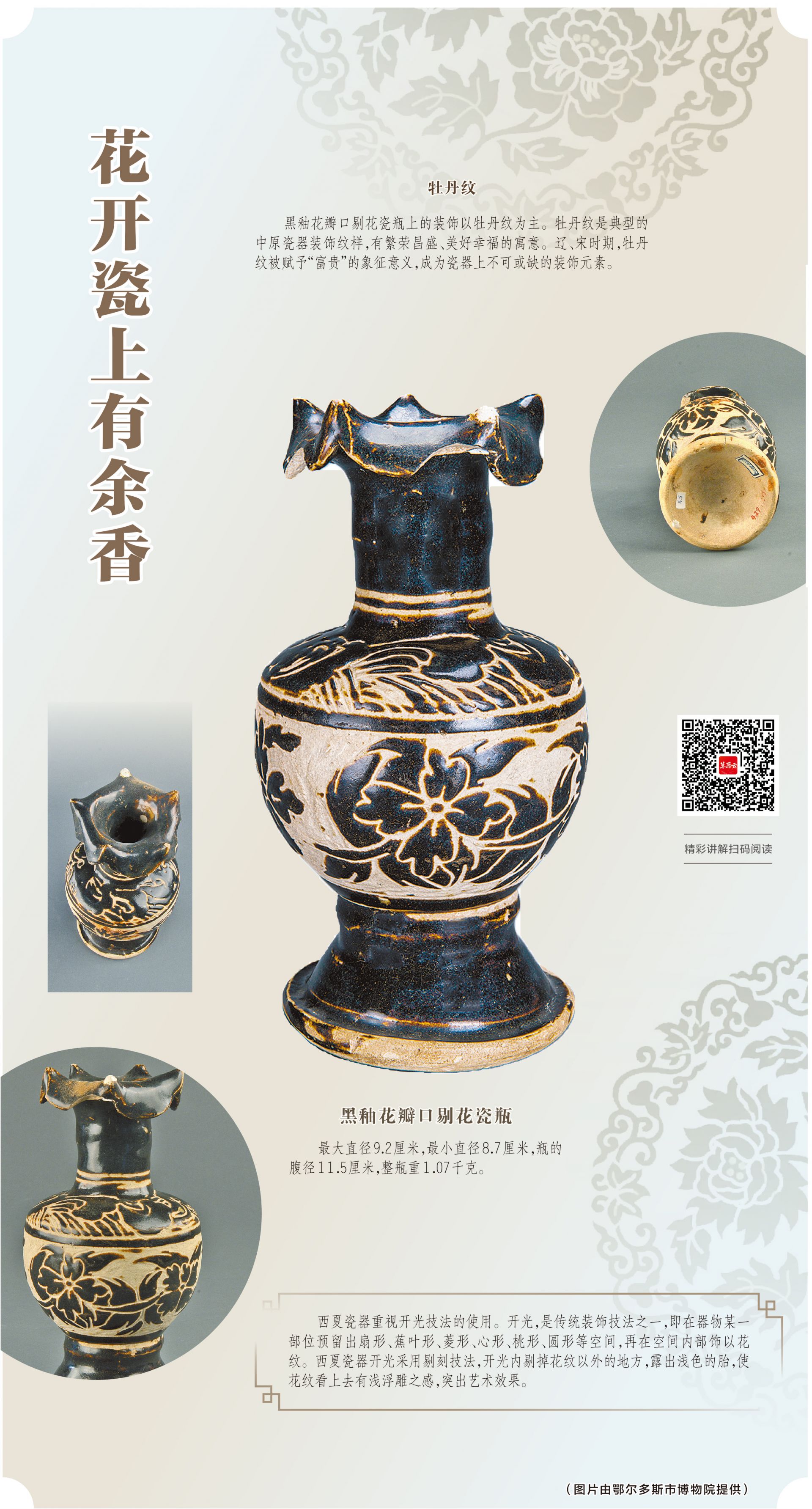 我来自西夏,浑身都是亮点:花瓣形瓶口,开光处剔刻着牡丹花。制作我的西夏工匠在中原瓷窑的剔花技法上进行了创新。