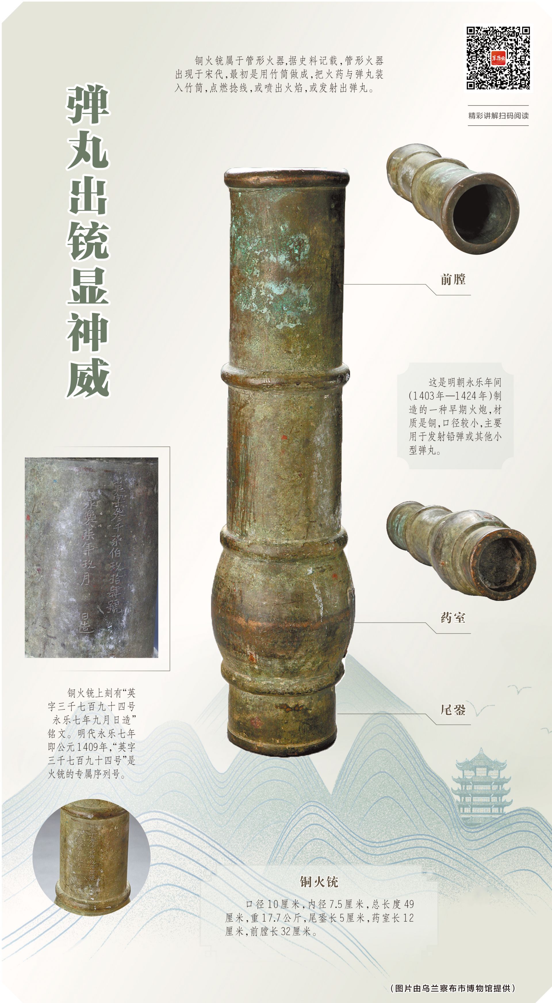 火药是中国古代四大发明之一,管形火器将火药推到更高的位置。在乌兰察布市博物馆“辽——清的乌兰察布”展厅陈列着一件制造于明代永乐年间的铜火铳,口径10厘米,内径7.5厘米,总长度49厘米,重17.7公斤,尾銎(qióng)长5厘米,药室长12厘米,前膛长32厘米。